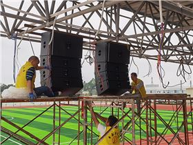 茂名市第一職業技術學校體育場在擴聲系統配置過程中采用JSL爵士龍戶外線陣音箱系統、中遠程全天候防水音箱、配套產品包括超低音音箱、專業功放、無線話筒、處理器、調音臺等產品。