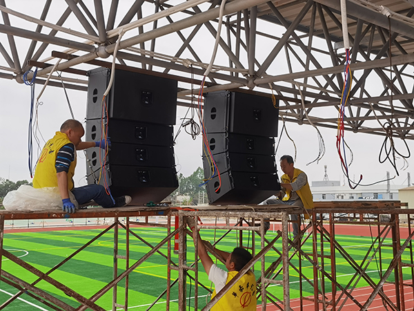 茂名市第一職業技術學校體育場在擴聲系統配置過程中采用JSL爵士龍戶外線陣音箱系統、中遠程全天候防水音箱、配套產品包括超低音音箱、專業功放、無線話筒、處理器、調音臺等產品。