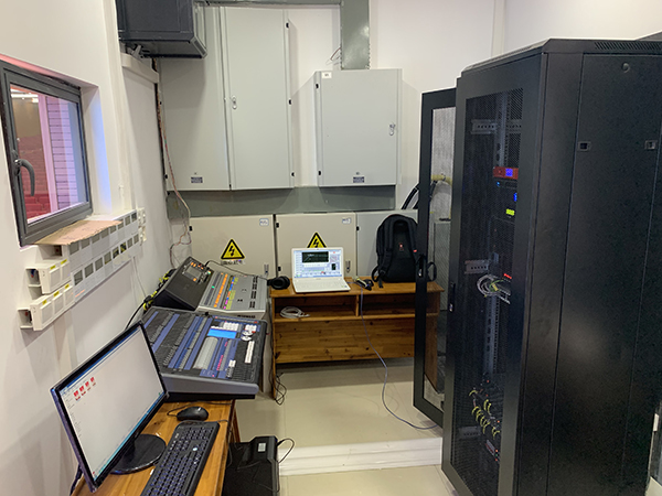 朝陽中學劇場主擴聲系統采用LAB-610線陣列揚聲器打造,在舞臺兩側和舞臺中央作為主擴聲,MH系列功放,8進8出DMD188數字處理器,CF-12全頻音箱搭配在舞臺兩側作為拉像補聲以及使用WS215超低音做為低音補償,除此之外還有CU12作為舞臺返聽。VS210數字手拉手會議系統及雅馬哈數字調音臺等產品。
